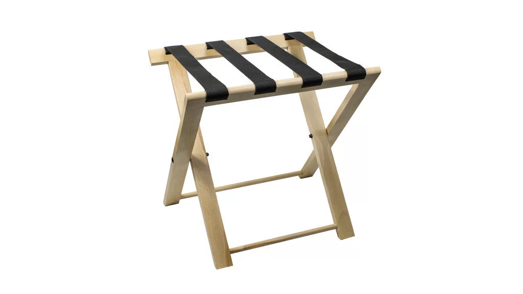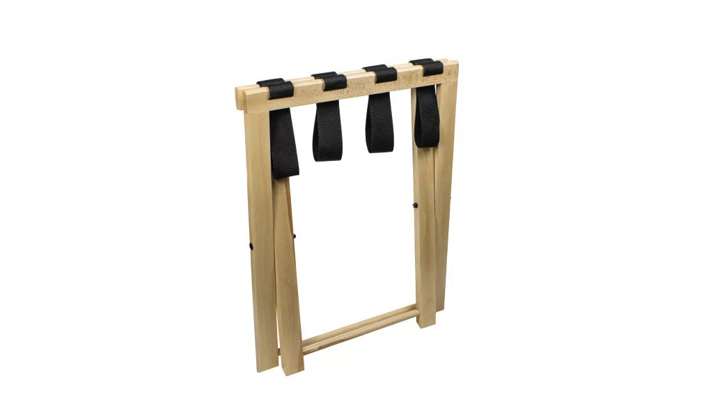 The DELTA Hotel Luggage Rack is a practical solution for guests to pack comfortably. By using the rack, guests can avoid placing their suitcases on the bed or armchair, thus protecting bedding and furniture from dust and dirt. The product is made of high-quality solid bamboo, which is not only durable but also environmentally friendly. The rack is easy to store and has strong, interchangeable straps that are available in different colors, so you can also match the look of the room. The dimensions of the rack are ideal for hotel rooms: width 57.5 cm, length 39 cm, height 46.5 cm, and when folded, it is only 5.5 cm wide. In addition, the product comes with a two-year warranty, so you can be sure that it will be a reliable companion in hotels for the long term. The manufacturer's environmentally conscious approach is also commendable, as they plant a tree for every third product purchased, thus contributing to sustainability.