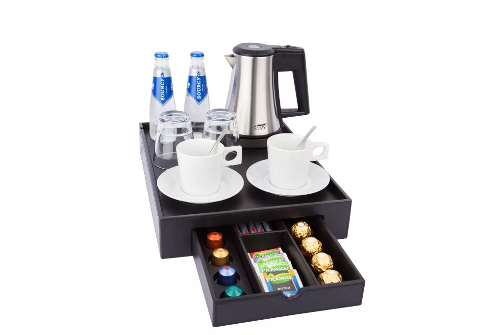 Space tray with 0,5L kettle and 2 white cups