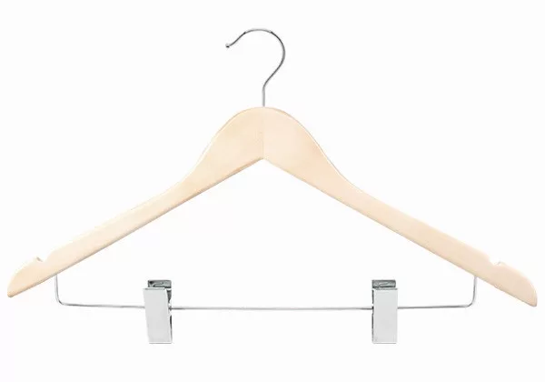 1) Question: What material is the UNFINISHED Trouser Hanger with Clips made of? Answer: The hanger is made of solid maple wood, without chemical varnishes.