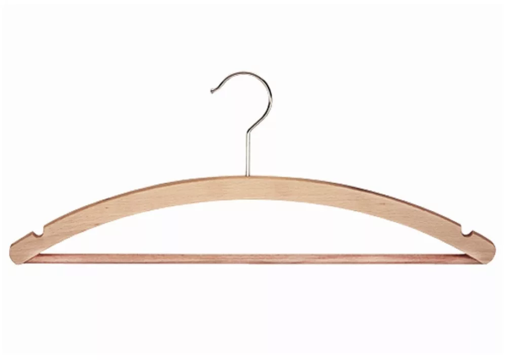 The UNFINISHED hanger CLASSIC STANDARD/RE is a timeless and practical solution for organizing your clothes. The wooden hanger is made of maple wood with a smooth surface, which is not only aesthetic but also durable. The hanger is equipped with a special non-slip trouser holder, which allows trousers and skirts to be hung safely and easily. The fringed design on the upper part of the hanger helps to keep the clothes in place, preventing them from slipping. The 360° rotating chrome-plated hook is extremely practical, as it allows you to turn the hanger in any direction, making the hanger versatile. The dimensions of the product are ideal for adult clothing, as it is 42 cm long, 13.5 cm high and 1.2 cm thick. The semi-finished color gives it a unique look that fits the style of modern homes. The UNFINISHED hanger not only fulfills its function, but can also be a decorative element of your wardrobe. An ideal choice for those who love tidy and stylish storage. The product is easy to use and helps keep your clothes tidy and accessible at all times. FAQ (5 questions/5 answers): 1) Question: What material is the hanger made of? Answer: The hanger is made of maple wood, which is durable and long-lasting. 2) Question: What size is the hanger? Answer: The hanger is 42 cm long, 13.5 cm high and 1.2 cm thick. 3) Question: What clothes can be hung on it? Answer: T-shirts, shirts, trousers, skirts and dresses can be hung on the hanger. 4) Question: Does it have a non-slip function? Answer: Yes, the hanger is equipped with a non-slip trouser strap that prevents clothes from slipping. 5) Question: What color is the hanger? Answer: The hanger is semi-finished in color, which gives it a unique look.