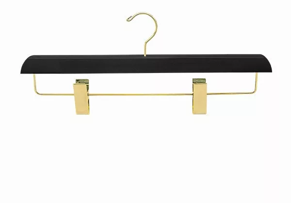 The wooden hanger with trouser clips offers a modern solution for storing and organizing clothes. It is specially designed for skirts and trousers, making it an ideal choice for those who want to protect their clothes from wrinkles and damage. The hanger is made of solid maple wood, which is not only aesthetic but also durable. It is available in different finishes, so it can easily fit into any interior. The two adjustable clips with non-slip rubber lining ensure that clothes are securely attached and without marks. These clips can move along the hanger, allowing for easy use of different clothing styles and sizes. The chrome-plated rotating hook allows the hanger to be easily positioned in any direction, making it a practical solution for everyday use. The hanger is 36 cm long, 18 cm high and 1.2 cm thick, which provides the perfect size for safe storage of clothes. The black color adds elegance, while the gold-colored accessories highlight the premium quality of the product. The wooden hanger with trouser clips is an ideal choice for any man who wants to preserve the shape and condition of his clothes.