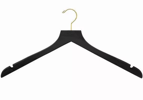 3) Question: What color is the hanger? Answer: The hanger is black with a gold hook.